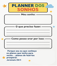Aqui os sonhos ganham forma! Um espaço encantador para seu filho desenhar ou escrever metas, orar por elas e aprender que Deus tem planos lindos para quem planeja com sabedoria e fé (Jeremias 29:11).